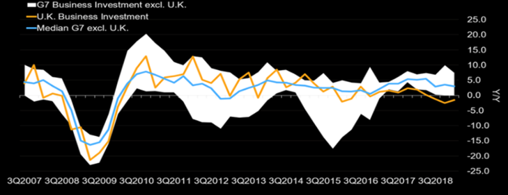 There is a growing fear that uncertainties around Brexit will push the UK into recession. The UK economy is currently forecasted to grow at a rate 1.3%, down 0.2% from May 2019 projections of 1.5%. Domestic investment from UK firms has weakened since 2016 as the UK-EU membership referendum has driven companies to relocate head offices or production lines out of the UK. Even amid a strong synchronised global economic recovery in 2018, capital spending in the UK fell every quarter.