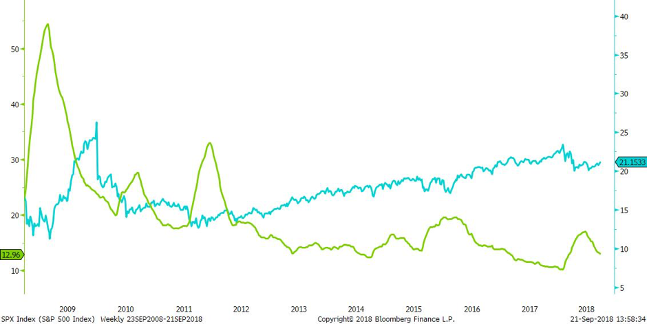 圖四:美國標普指數市盈率(藍線)與CBOE VIX指數(綠線)